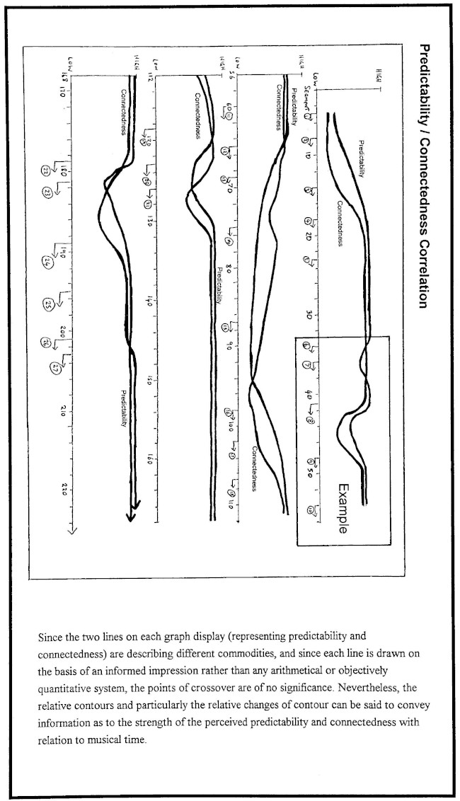 Since the two lines on each graph display (representing predictability and connectedness) are describing different commodities, and since each line is drawn on the basis of an informed impression rather than any arithmetical or objectively quantitative system, the points of crossover are of no significance. Nevertheless, the relative contours and particularly the relative changes of contour can be said to convey information as to the strength of the perceived predictability and connectedness with relation to musical time. |