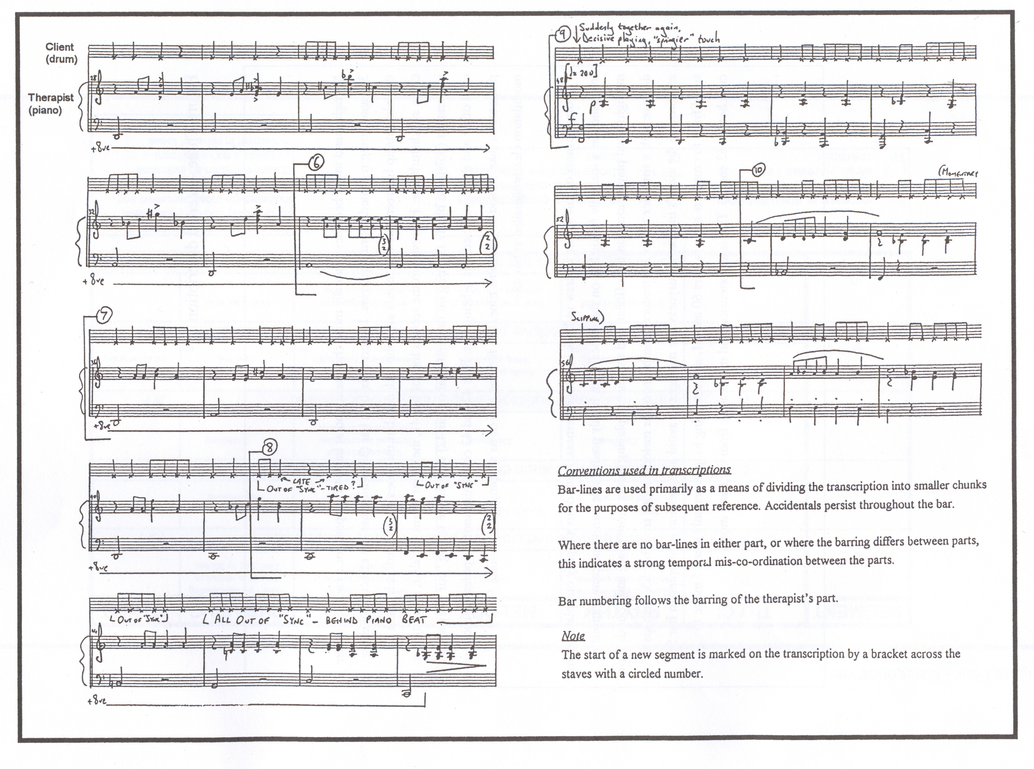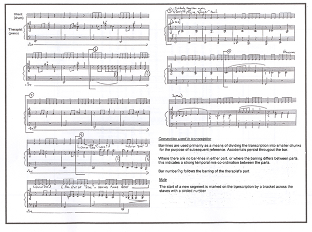 On the basis of the verbal description, the extract is divided into smaller segments, each containing events of significance for the subsequent consideration of predictability in the therapist's musical input, its contexts and effects. The segments are marked on the musical transcription. | To produce manageable and meaningful chunks for analysis of the relationship between the nature of the therapist's musical input and the nature of the musical co-improvisation. | Fig. 2 |
