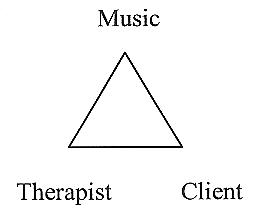First the relation between the therapist and the client may be seen to be mediated by the music. The music is not just sent off across a line in a single direction. Within this basic triangle model a reciprocal relation between therapist and client is indicated, through music. The therapist may address the client. And the therapist may also respond to the client's address to him. This becomes a process of reciprocity. Music between therapist and client may facilitate a communication, a mutual address and response through music. A triangle in this way indicates not simply a one to one connection between a therapist and a client, but a relation between the two mediated by music.