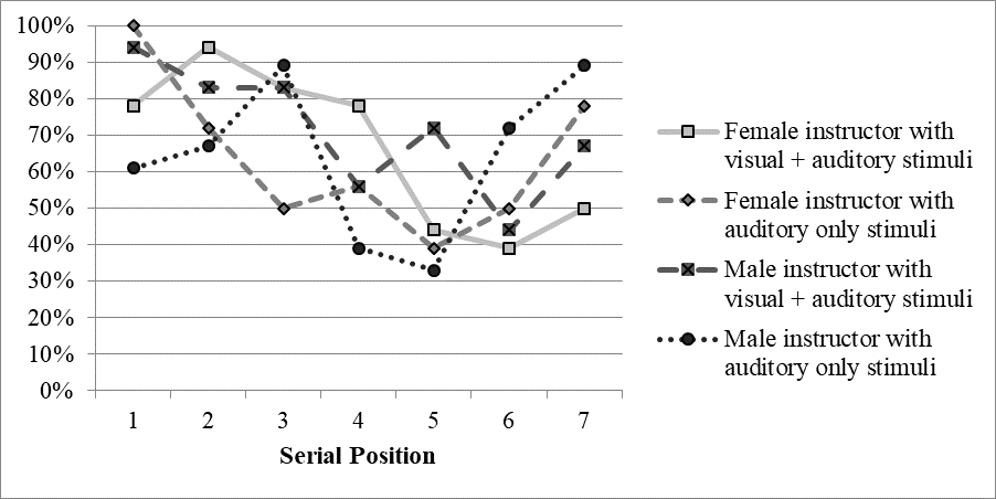 Research question four: More accurate working memory recall is typically observed in sequential positions of primacy and recency and numerous interactions between serial position and other variables have been previously reported (Schwartzberg & Silverman, 2012,, 2018; Ward, 2002). Therefore, the researchers did not statistically analyze recall data by serial position. Rather, the researchers graphed these data in Figures 1 and 2. Mean recall scores tended to be more accurate in serial positions of primacy and recency.