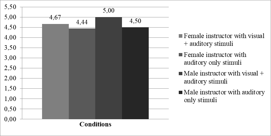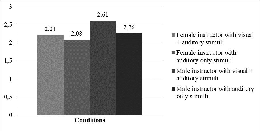 Research question two: There was no significant recall difference between visual + auditory stimuli condition and the auditory only condition, F(1, 54) = 1.824, p = .182, partial n2= .033. Although not significant, the mean recall tended to be slightly higher for the visual + auditory stimuli condition (M = 3.62, SE = 0.20) than for the auditory only condition (M = 3.32, SE = 0.16). A summary of the descriptive statistics and pairwise comparisons is reported in Tables 1 and 2, respectively.