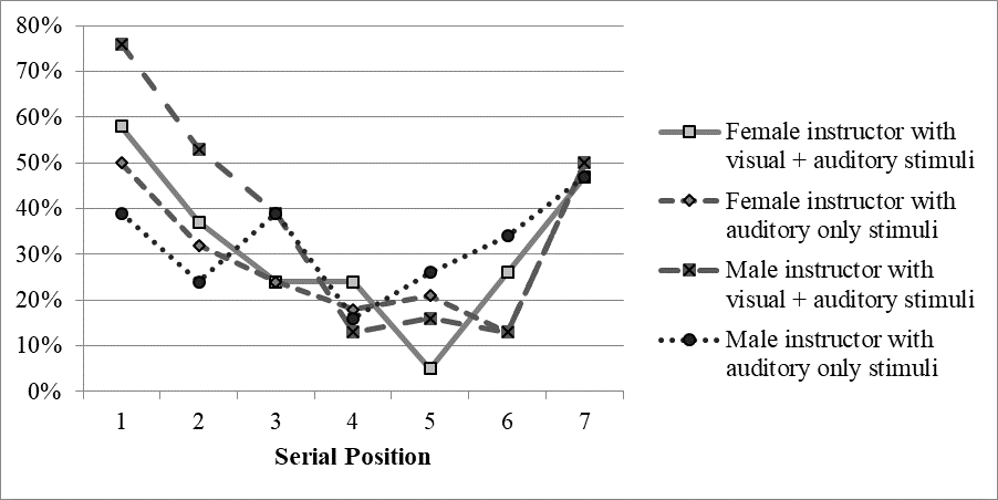 Research question one: There was no significant difference in sequential recall between male and female instructors, F(1, 54) = 1.432, p = .237, partial n2 = .026. Although not significant, the mean recall for the male instructor (M = 3.59, SE = 0.17) tended to be slightly higher than for the female instructor (M = 3.35, SE = 0.18).