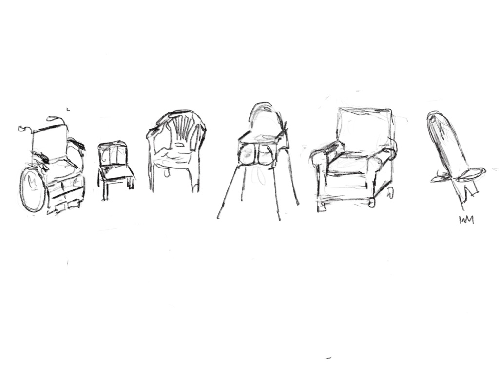What is a normal chair? Image description: A drawing of a wheelchair, a chair with a shorter leg, a plastic garden chair, a high chair, an arm chair, and an African chair.