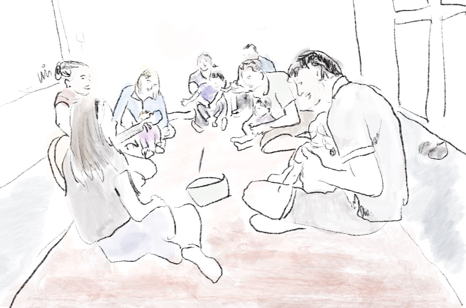 Representing the music café. Image description: A drawing of a group of people sitting in a circle on a floor.