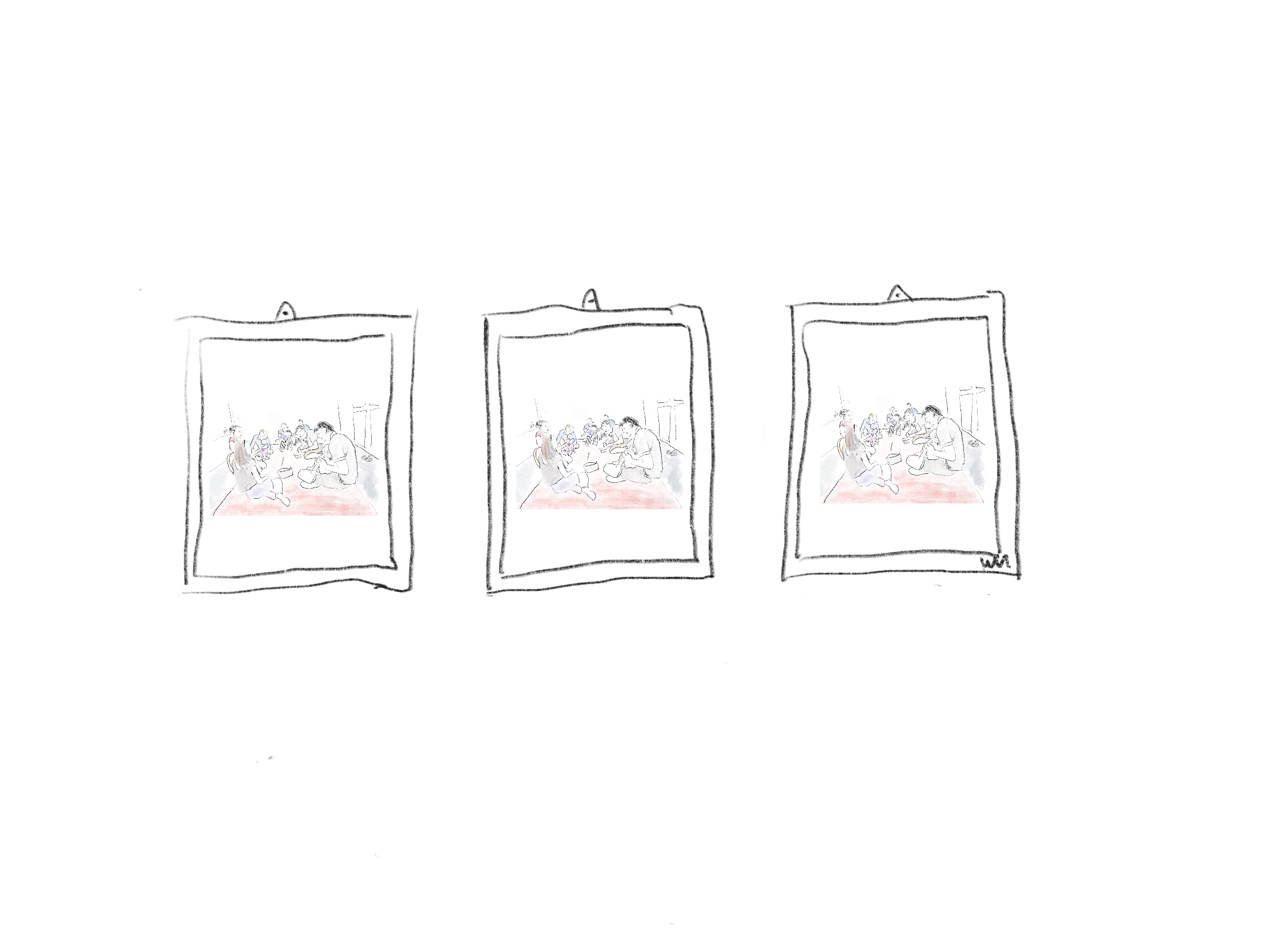 Shifting frames. Image description: Three frames in a line with the same drawing of a group of people as in figure 2 inside.