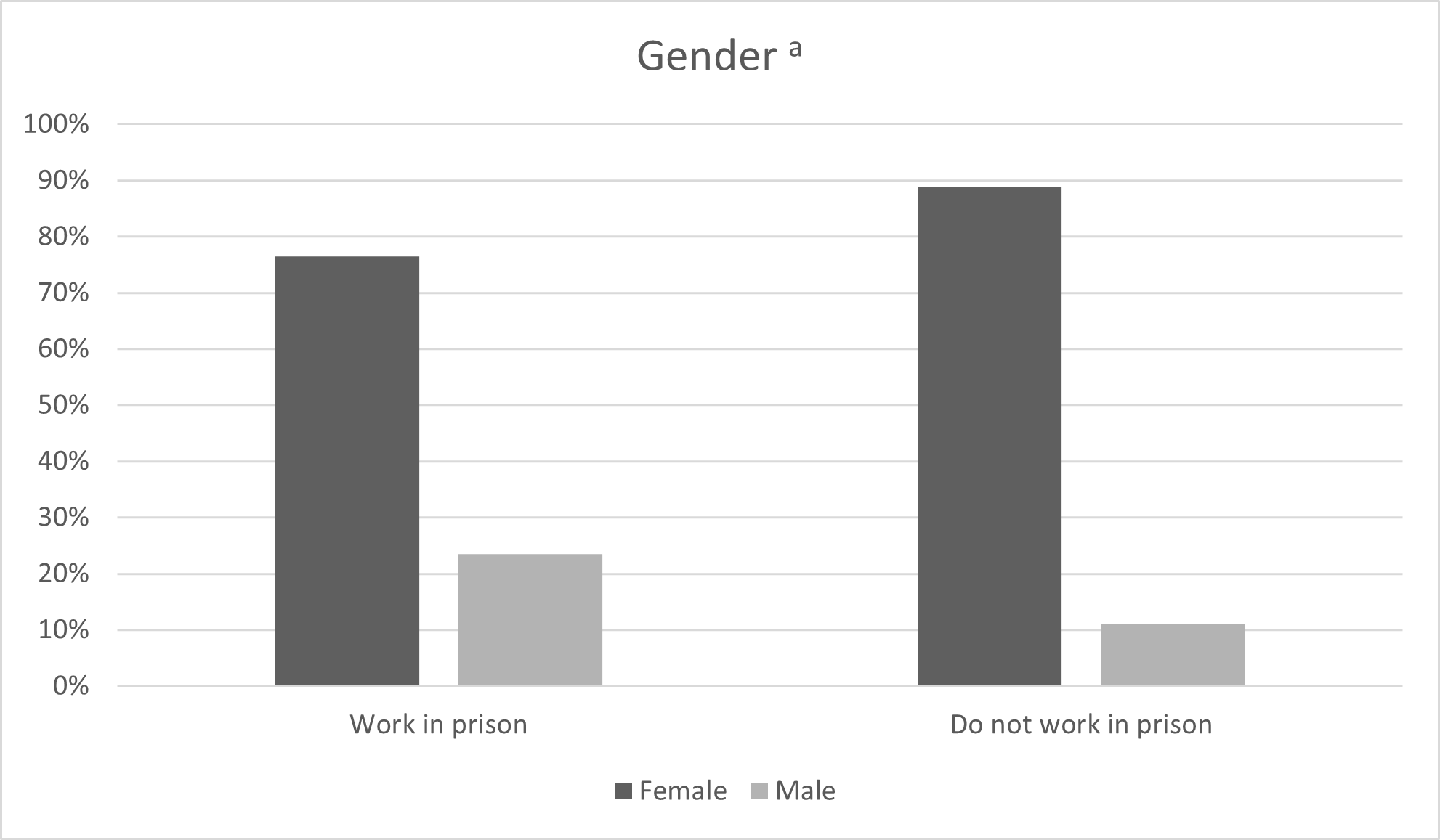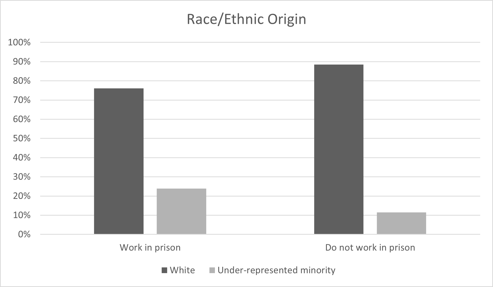 Table 1 shows the gender and race/ethnic origin of participants who worked in prison compared to those who did not. Two Pearson's chi-square tests revealed significant differences between music therapists who worked in prisons and music therapists who did not work in prisons with regard to gender, χ2 (1) = 6.57, p = .015, and ethnic origin χ2 (1) = 5.82, p = .021. Among music therapists who reported they did not work in prisons, females outnumbered males by an odds ratio of 7.98, whereas female music therapists working in prisons only outnumbered male music therapists working in prisons by an odds ratio of 3.25. Among music therapists who did not work in prisons, white music therapists outnumbered under-represented minorities by an odds ratio of 7.71, whereas white music therapists working in prisons only outnumbered under-represented minorities by an odds ratio of 3.18. Based on the odds ratios, the odds of a music therapist being male or non-white were 2.46 and 2.42 times greater, respectively, if one practiced music therapy in prison settings. Figure 2 and Figure 3 show key differences in gender and ethnic origin for music therapists who worked in prisons and music therapists who did not.