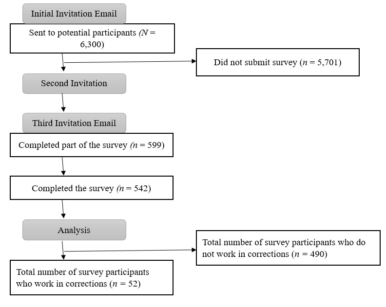 When asked about political affiliation, 17% (n = 9) of participants who reported working in corrections did not select a response. Of those who did select their political affiliation (n = 43), the majority (72%, n = 31) reported they were Democrats, whereas 21% (n = 9) were Independent and 7% (n = 3) were Republicans. Most of the participants (n = 50) who responded to the question “To what degree do you believe your religious and/or spiritual views influence your decision to work in correctional/forensic settings?” selected “not at all” (52%, n = 26), whereas fewer participants reported that their religious and/or spiritual views somewhat (26%, n = 13) or greatly (22%, n = 11) influenced their decision to work in corrections. Two participants who reported working in corrections did not respond to the question about religious and/or spiritual views.
