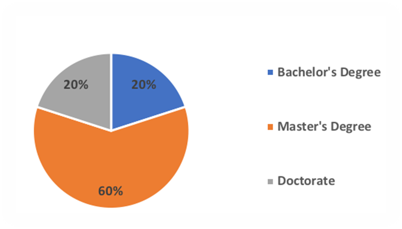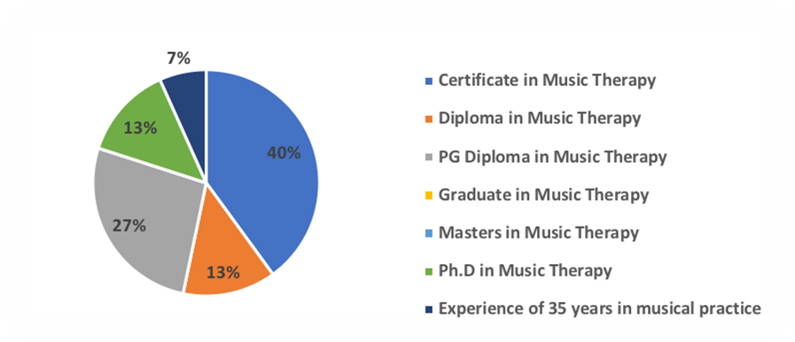 In this direction, Indian organizations such as Nada center for music therapy, Chennai school of music therapy, Music Therapy Trust, etc. have been offering certificate and diploma courses that are delivered online as well as offline. Offline courses offer either on-campus learning or distance learning for students with the help of study material, internships, lectures and training with experts, along with project works. Students pursue research work in music therapy to explore practical and theoretical aspects of music therapy. The Mahatma Gandhi Medical College and Research Institute (Shree Balaji Vidyapeeth, Puducherry) offers postgraduate diplomas, master's degrees, and doctoral degrees in Medical Music Therapy where students study the theory of music therapy and learn and practice its application in outpatient departments of the hospital, specialty rooms, and music therapy rooms of the hospital. They learn the application of music in various therapeutic settings with a diverse population (CMTER, 2021). The online survey conducted was helpful for understanding two important things about the educational background of music therapists in India. First, the majority of respondents either have certificates or diplomas as their educational qualification of music therapy (Fig.1). Along with the music therapy background, a large number of respondents have master's degrees as their highest qualification in different streams like Vedic astrology, divinity, Indian (Hindustani or Carnatic) classical vocal music, psychotherapy, counseling, psychology, communication, orthopedics, pediatrics, computer science, etc.; whereas some of them hold degrees in music, medicine, science, journalism, or philosophy, or hold doctorate degrees in their respective streams (Fig.2). Secondly, the survey found that a large number of therapists have earned their certificates or diplomas in music therapy either from Nada center for music therapy or from Chennai school of music therapy (Fig.3). The Chennai school of music therapy provides online-offline courses, along with an on-campus internship training of 750 hours at Mahatma Gandhi medical college and research institute, Puducherry, for candidates pursuing the Post-graduate Diploma in music therapy (PGDMT) (Sundar, 2012). With the facility of coursework and on-campus internship in a hospital in partnership with the center for music therapy education and research of Shri Balaji Vidyapeeth, Chennai school of music therapy has been providing professional training and certification in music therapy. Also, the Center for music therapy education and research has been providing diploma, graduate, post-graduate, and research degree programs in medical music therapy.