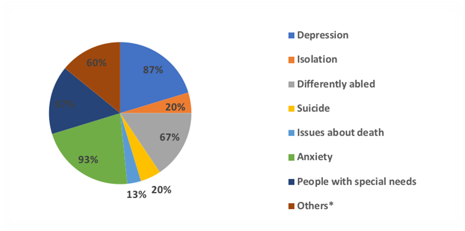 People with mild and severe psychological, emotional, and behavioral problems, can get benefits from music therapy interventions. The survey included both private practitioners and people working in hospitals and other therapy centers or clinics. It was found that most of the people visiting therapists suffer from anxiety, with the second-most common health issue being depression (Fig.4). Less common reasons for visiting a music therapist (labelled “other” in Fig.4) include people with: death in the family or of near and dear ones; autism spectrum disorder; attention deficit hyperactivity disorder; schizophrenia; stress and psychosomatic disorders; alcohol or drug addiction; cancer or tumors; bipolar disorder; dementia; geriatric care; pregnancy-related issues; menopause; various neurological, neurosurgical and psychiatric conditions; pain management; and low self-esteem and self-confidence; as well as people pre-, during, or post-surgery. The greatest number of patients visiting therapists belong to the age group of 11-15 years, whereas the least number of patients visiting falls under the age group of 16-20 years (Fig.5).