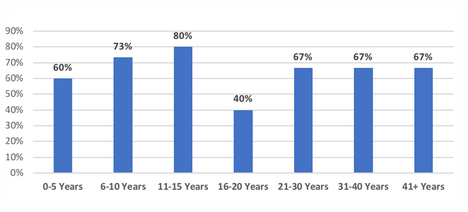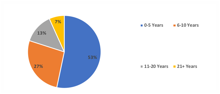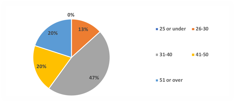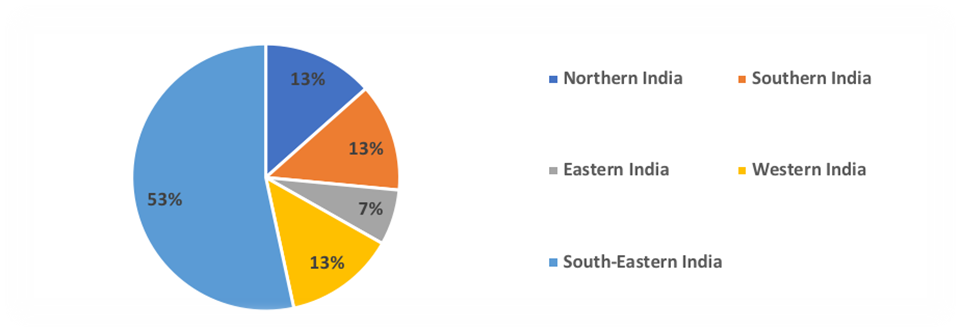 As per the responses recorded in the survey, less than half of the respondents belong to the age group of 31-40 years, while approximately one-fourth are in the age group of 41-50 years (Fig.6). When looking at the gender ratio between males and females in this profession, 60% are females while 40% of practicing therapists are male. As for the total work experience as a music therapist, half of the respondents have work experience of 0-5 years, while only a few of them have 21+ years of experience as a music therapist (Fig.7). The majority of respondents are practicing music therapy as their primary profession, while few are practicing this profession as a secondary option, or they are involved in music therapy practices along with their primary professions such as Carnatic music teacher, orthopedic surgeon, pediatric allergist, consultant orthopedic surgeon, and associate professor (Fig.8). Another important thing that came to light with the help of this survey was that more than half of the therapists reside in the Southern and South-Eastern part of India (Fig.9).