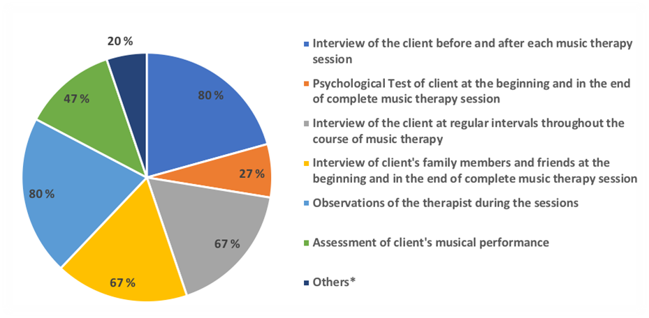 Assessment and Evaluation Process: As per the survey, the majority of therapists report interviewing their client before and after each music therapy session, and observing the client during the sessions. On the other hand, evaluation and assessment with the help of psychological tests are less popular among music therapists, which received the least number of responses that show little knowledge of such tests among music therapists in India (Fig.15). On the contrary, Dr. Kinjalk assesses his clients over time, as their health situation develops. In his explanation, Dr. Kinjalk said that since 1996, his institute has been using Indian forms of music to help patients with stress-related disorders, hypertension, diabetes, depression, insomnia, anxiety, learning difficulties, and Alzheimer-like ailments. Although KIMMA music therapy does not replace the medicines his patients receive, according to Dr. Kinjalk this method may provide fast relief from the symptoms of pain, anxiety and depression for those suffering from cancer, HIV, hypertension, anxiety, and depression.