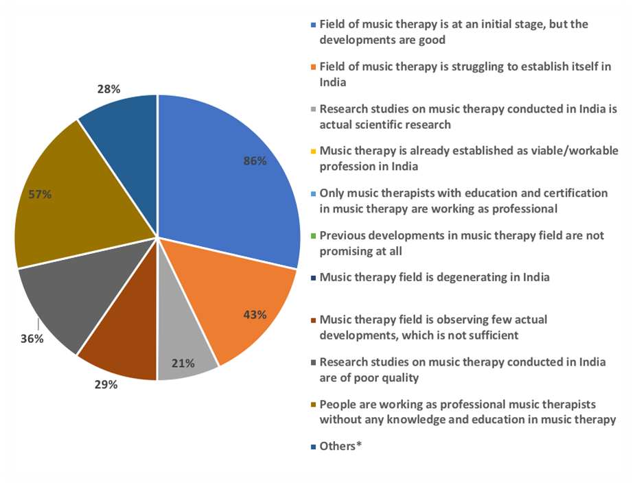 Note. *Includes “open-ended answers”; “lack of standardized training method”; “Indian music therapy will take time to develop because of the vastness, spirituality, and abstractness in Indian music”; “music therapy in India is taking longer time due to the varied cultural and musical orientations of India.”