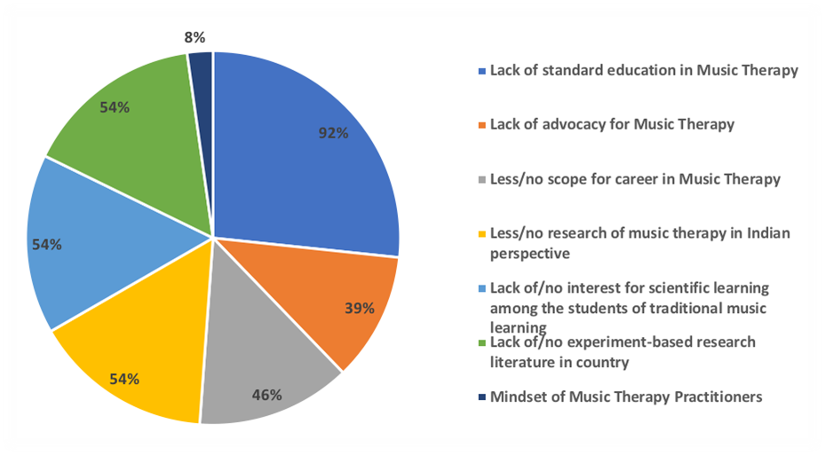 In the survey, it was made clear by the respondents that the expansion of music therapy in India is negatively affected by the lack of standard education, lack of interest in scientific learning among the students, and lack of experiment-based research literature in the country (Fig.19). Some respondents reported that the mindset of music therapy practitioners is also a factor.