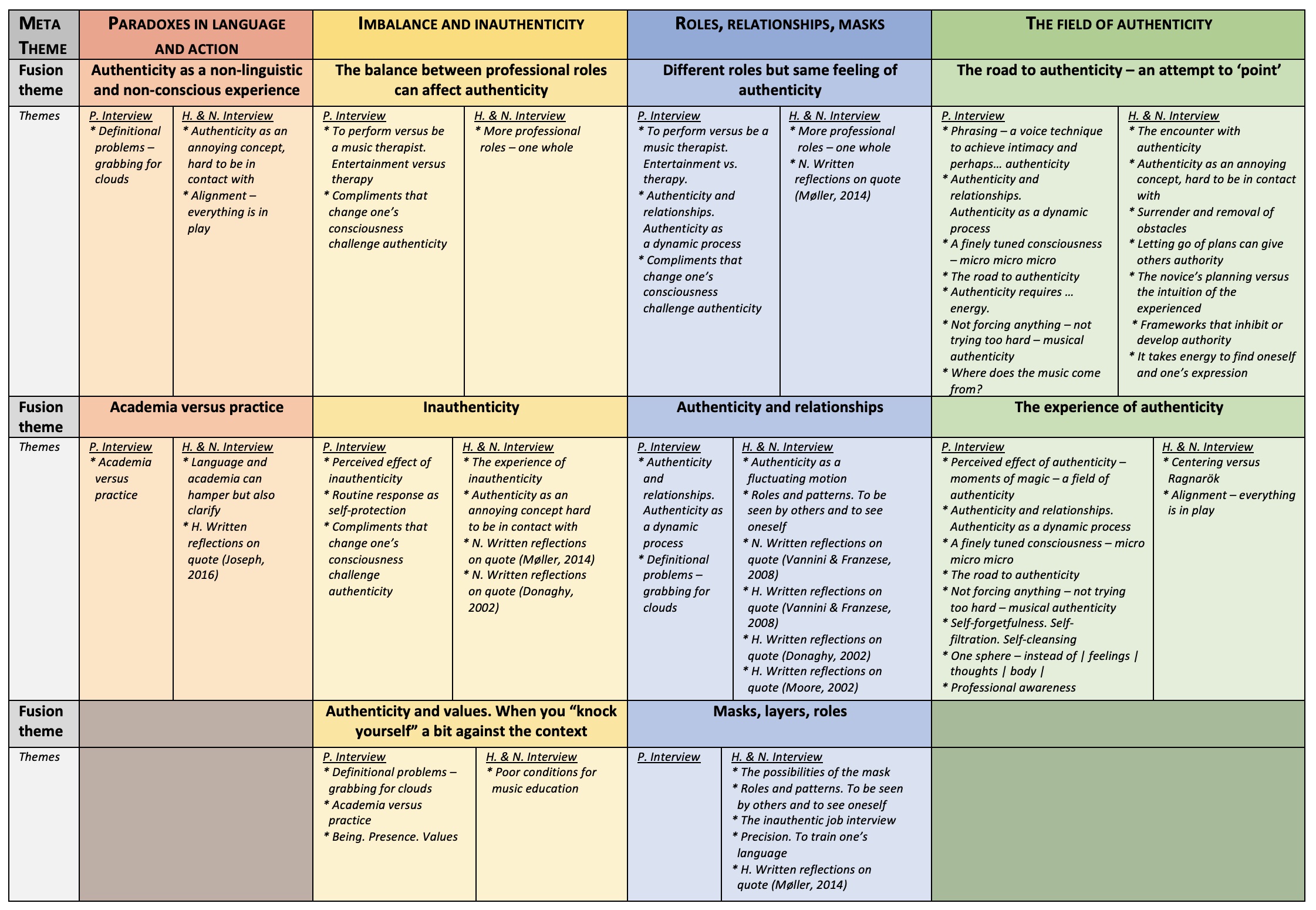 Across music disciplines, authenticity has been referred to in various ways. Within music therapy and music teaching, only sparsely has it been discussed focusing on the intrapersonal aspects of authenticity. This study seeks to explore and understand authenticity as experienced and expressed by three music professionals practicing within the areas of music therapy, music teaching, and music performance, the goal being primarily to deepen, enrich, and understand the authenticity experience to possibly benefit professionals and their clients, students, and audiences. Three music professionals holding various professional backgrounds were selected based on their assumed ability to reflect on this rather philosophical topic. Preparatory materials were sent out to participants prior to conducting two semi-structured interviews – 1 solo interview and 1 group interview. The interviews were transcribed and analyzed through a thematic coding analysis revealing four meta themes: 1) paradoxes in language and action, 2) imbalance and inauthenticity, 3) roles, relationships, masks, and 4) the field of authenticity. Findings were discussed with chosen theory synthesizing the experience of authenticity as being associated with several interconnected elements: relationship (with self and others), role (self-chosen and assigned), context (role fits the context), professionalism (having skills needed, letting go of control), and personality (transparent persona).
